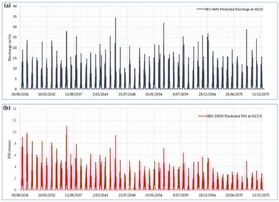 Figure 7. (a) HEC-HMS simulated daily discharge at GCUS till 2075. (b) HEC-HMS simulated daily FSS output at GCUS till 2075.