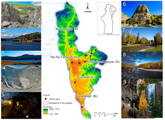 The Koktokay GGp is located in Fuyun County and Qinghe County, Altay Region, northern Xinjiang Uygur Autonomous Region (Figure 1). It is 30 km away from National Highway 216 to the south, 53 km away from Fuyun County to the west, 290 km away from Altay City, and 528 km away from Urumqi City. The Koktokay GGp is generally composed of five major scenic areas, including Saihengbulak, the No. 3 Mine Pit, Erkis Grand Canyon, Cocosuri, and Karashanger. It was officially approved as a GGp in 2017. The Koktokay GGp includes mountain scenery, waterscapes, grassland, strange rocks, hot springs, and other landscapes, with diverse geoheritage and landforms as well as rich visualscape resources. The geopark also includes Erkis River, Eremu Lakes, and Cocosuri, with desirable hydrological conditions, diverse vegetation types, and abundant wildlife resources, as well as diverse soundscape resources. Therefore, the Koktokay GGp is a typical research area worth exploring.