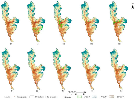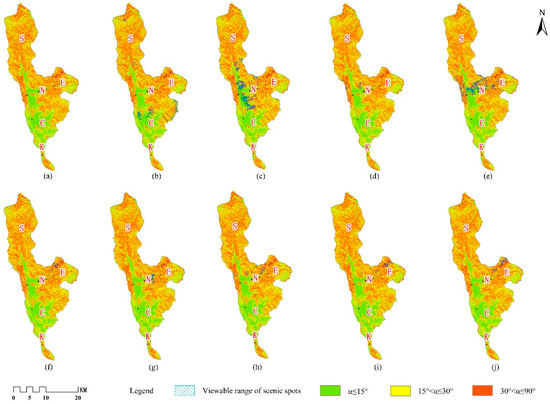 Relative slope sensitivity of the viewable range of each scenic location. (a–j) Karashanger Earthquake Fault Zone, Cocosuri, Eremu Lakes, The No. 3 Mine Pit, Aiguzi Mine, Shenzhong Canyon, Betula Forest, Golden Triangle, Waterfall Fossil, and Karadrola Falls. Five major scenic areas, including Saihengbulak (S), The No. 3 Mine Pit (N), Erkis Grand Canyon (E), Cocosuri (C), and Karashanger (K).
