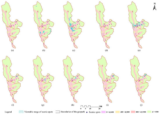 Relative distance sensitivity of the viewable range of each scenic location. (a–j) Karashanger Earthquake Fault Zone, Cocosuri, Eremu Lakes, The No. 3 Mine Pit, Aiguzi Mine, Shenzhong Canyon, Betula Forest, Golden Triangle, Waterfall Fossil, and Karadrola Falls. Five major scenic areas, including Saihengbulak (S), The No. 3 Mine Pit (N), Erkis Grand Canyon (E), Cocosuri (C), and Karashanger (K).