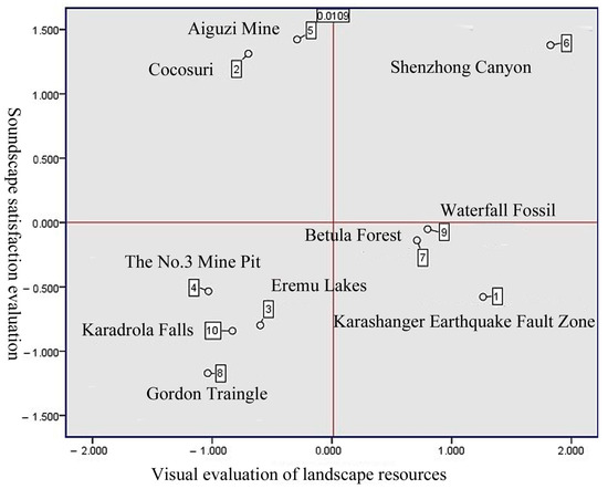 The satisfaction scores of soundscapes, as rated by tourists, in each scenic location were standardized and placed in a two-dimensional quadrant with the standardized results of visualscape evaluation. Visualscape evaluation was represented on the horizontal axis, and soundscape satisfaction evaluation was represented on the vertical axis. The average value of the two evaluations was calculated as the dividing point of the horizontal and vertical axes to divide the four quadrants, and the final result was determined as the corresponding position in each of the four quadrants. Thus, we built a landscape audiovisual preference matrix model of the Koktokay GGp (Figure 6).