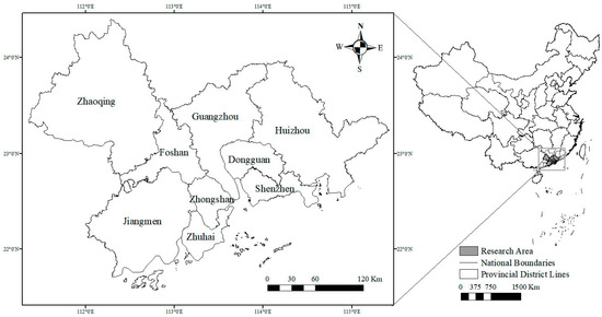 As a production factor existing in the economic system, ecological capital affects the growth of the regional economy [40], and promotes the welfare of the people and wealth accumulation [41]. Therefore, based on the framework of ecological efficiency [42], ecological capital is included in the variables of the ecological economic growth model, and, together with traditional production factors, is the main factor to enhance the coordination between ecology and economy [43]. The ecological product conversion efficiency, representing the efficiency of converting GEP into GDP, was selected to evaluate the degree of transformation of ecological environment resources into economic benefits to measure the degree of ecological and economic coordinated development [44], which is an important basis for the scientific evaluation and continuous optimization of ecological product value. To empirically analyze the forest ecological products (hereafter referred to as FEPs) conversion efficiency, this paper uses the Pearl River Delta (hereafter referred to as PRD) region as an example.