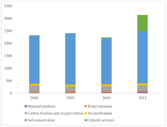 During the period 2000 to 2015, the value of FEPs in the PRD ranged from CNY 222.381 billion to 314.051 billion (calculated at constant prices in 2000) (Figure 2). In 2015, the total value of forestry ecological products in the PRD was about 0.97 times the total forestry output value. Among them, the regulatory services value was the highest, CNY 242.844 billion, accounting for 77.33% of the total value; the value of cultural services was CNY 66.36 billion, accounting for 21.13% of the total value; the value of material products was CNY 4.847 billion, accounting for 1.54% of the total value (Table 4). Six ecological products can be ranked in order of value: soil conservation > cultural service > carbon fixation and oxygen release > air purification > material product > water retention. Among them, the values of soil conservation and cultural services accounted for 87.40% of the total, making up the largest proportion.