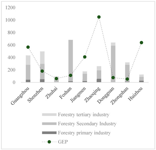 Different from FEPs, the total output value of forestry in the PRD showed a continuous upward trend (Figure 4). From 2005 to 2015, the output of the forestry industry rose rapidly, benefiting from the rapid development of the secondary and tertiary industries, while the value of FEPs showed a downward trend between 2005 and 2010, mainly due to the decline in the regulating services value; water conservation, and carbon fixation and oxygen release values also declined. However, in the following five years, the FEPs value greatly improved. This growth mainly came from the improvements in cultural value. In terms of cities, the output values of Guangzhou, Jiangmen, Zhaoqing, and Huizhou are higher than the value of FEPs, while the value of FEPs is higher in other cities.