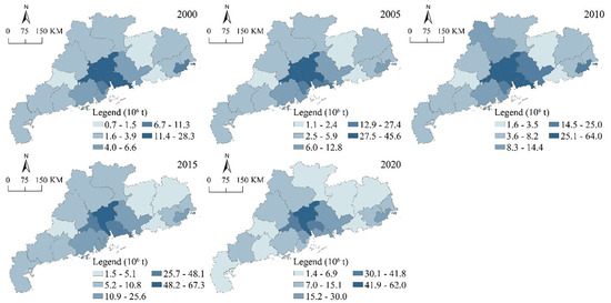 From the spatial pattern perspective shown in Figure 3, it can be observed that the distribution of urban CO2 emissions exhibits a clear clustering phenomenon. During the study period, the high-carbon cities remained concentrated in the Pearl River Delta, particularly the cities of Guangzhou, Foshan, Dongguan, and Shenzhen. These four cities have been the leading economic powerhouses in Guangdong Province for many years, with a higher level of industrialization compared to the other regions, and they have attracted many manufacturing factories. Apart from the Pearl River Delta, there is little difference in the carbon emissions among the northern, eastern, and western regions, with only the city of Shantou showing higher carbon emissions, as it is predominantly an industrial city. From a temporal evolution perspective, Guangdong Province’s urban carbon emissions exhibit an alternating pattern. The difference in carbon emissions between the northern, eastern, and western regions and the Pearl River Delta region shows a decreasing trend followed by an increasing trend, indicating a significant imbalance in the spatial distribution of carbon emissions.