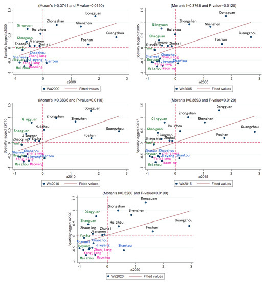 The local Moran’s I index can overcome the limitations of the global Moran’s I index, as it can identify spatial heterogeneity caused by spatial autocorrelation and determine the hotspots of attribute values for spatial objects [45,46]. A Moran scatterplot is one of the research methods used in local spatial autocorrelation analysis, as it is commonly employed to explore the instability of local spatial patterns. The four quadrants in the scatterplot correspond to four types of spatial relationship patterns between the spatial units and their neighboring units within a region. In this study, a Moran scatterplot analysis was conducted to examine the clustering and dispersion patterns of carbon emissions in the urban areas of Guangdong Province at the local spatial level. After constructing the spatial matrix in GeoDa, the data were imported into Stata 16 to generate the Moran scatterplots for the five-year intervals.