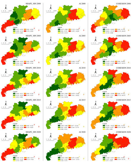 Spatiotemporal evolution of USS zoning in Guangdong Province, 2000–2020. Total area (TA), largest patch index (LPI), mean perimeter-to-area ratio (PARA_MN), average shape index (SHAPE_MN), aggregation index (AI), and patch cohesion index (COHESION).