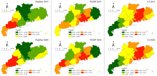 The socio-economic factors only show noticeable spatial variations in their impact on carbon emissions (see Figure 7). The PopDen has a positive impact on carbon emissions in the western region, whereas it has a negative impact in the other three regions. The PGDP has a positive impact on urban carbon emissions, with its highest influence in the Pearl River Delta and a gradually increasing influence in the western region. The CI has a positive impact on carbon emissions in all the cities in the province, but the regression coefficients are generally small, indicating varying degrees of impact.