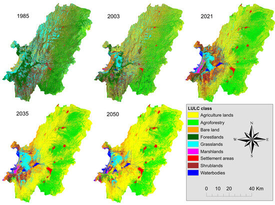 Nine LULC classes were identified, including waterbody, grasslands, forestlands, agriculture lands, bare land, settlements, agroforestry, shrublands and marshy area (Figure 3 and Figure 4). A detailed description of the LULC classification and change analysis can also be found in our recent study (Girma et al. [30]). In 1985, the largest land cover type was shrublands (24.3%) followed by forestlands (21.8%) and agriculture lands (19.8%) (Figure 3). However, agricultural lands, agroforestry and bare land showed increments and overturned the dominancy in 2003 and 2021 (Table S1). These unceasing expansion and trends will also be expected by 2035 and 2050 at the expense of forest, shrub and grasslands loss (Table S2). Moreover, the expansion of waterbodies (Figure 4), particularly along the shore side of Lake Abaya might be attributed to the displacement and lateral expansion of the lake’s water due to the increase in sediment load, resulting from soil erosion [65,66,67]. Rapid population growth, social instability, land policy, unproductive land and climate change were identified as the key driving forces of LULC changes in the area [33,68]. Land-use changes beyond land’s capability played a significant role in triggering land degradation [30]. To minimize these adverse consequences of land use change, it is recommended that adequate land use planning and management strategies must be implemented.