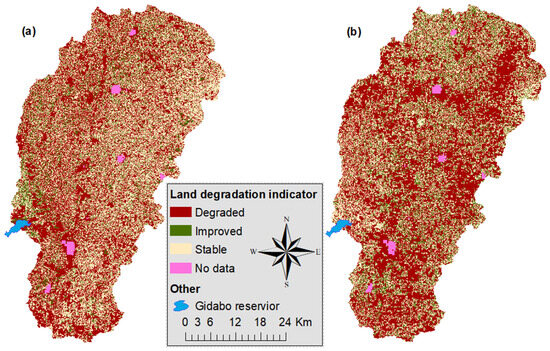 Land degradation neutrality indicator map between 1985–2003 (a) to 2003–2021 (b) in the Gidabo river basin.
