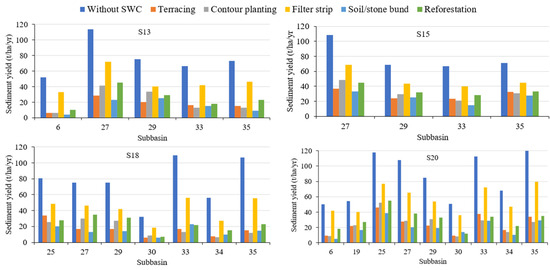 Furthermore, the spatial variability of sediment yield was identified for future combined scenarios. The combined scenario analysis (Section 3.5.3) depicted the insignificant intra-variability within each RCP scenario. Hence, we used a combination of one future period (2021–2040, 2041–2060) correspondingly for each projected land use (LULC 2035, LULC 2050) under each RCP (2 LULC 2 pathways 1 climate 4). In this line, S13 and S15 as well as S18 and S20 were considered for near and mid future scenario, respectively. Thus, the near future average annual sediment yield varied between 28.25 t/ha/year and 29.57 t/ha/year (S13 and S15, respectively), while the mid future average annual sediment yield ranged from 30.71 t/ha/year to 43.5 t/ha/year (S18 and S20, respectively). Among the 35 sub-basins (Figure 7), sub-basins 6, 19, 25, 27, 29, 30, 33, 34 and 35 will generate the highest amount of surface runoff and sediment yield in to the future (S13, S15, S18 and S20); thus, they were categorized under critical sub-basins.