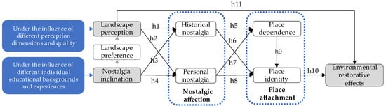 On the basis of the above evidence, h10–h11 can be proposed (Table 1). These two hypotheses are the basis for this research, both aimed at improving environmental resilience. In addition, it is necessary to verify whether nostalgic emotion and place attachment are mediating factors influencing the restorative effects of the environment through landscape perception.