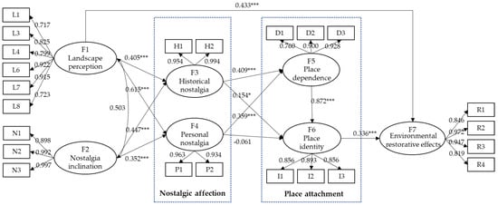 The results of the model fitting indicated: at first, the paths from landscape perception (h1 and h2) and nostalgia inclination (h3 and h4) to nostalgic affection were established. Second, among the paths from nostalgic affection to place attachment (h5 to h9), the path from personal nostalgia to place identification (h8) was not established, while all other paths were established. Third, the path from local identity (h10) and landscape perception (h11) to environmental restorative effects was established.