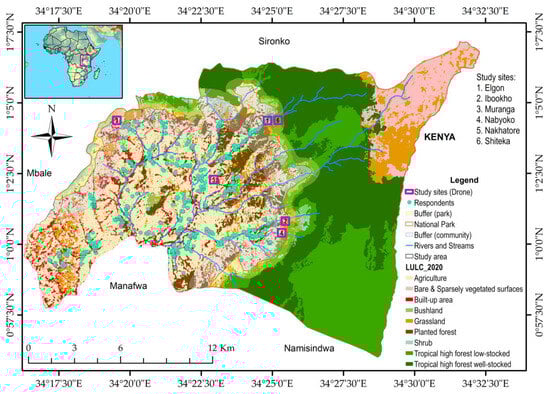 Location of the study area and land use within the upper Manafwa watershed. The drone activities were conducted in the six study sites along the park boundary and in the community land (pink squares).
