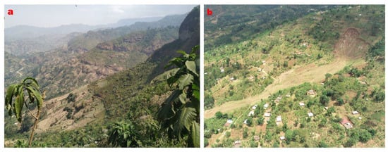 Natural landscapes are susceptible to both rapid and slowly occurring environmental changes [,]. These changes can stem from natural causes like earthquakes and mass movements, as well as human-induced factors [,]. Human activities, including intensive agriculture, deforestation, and human-induced bushfires, exert intense pressure on land and are unsustainable [,,]. Such heavy reliance on nature for survival accelerates the decline in vegetation cover and the degradation of natural resources [,] leading to increased land degradation, which, in turn, exacerbates secondary hazards such as soil erosion, landslides, and flash floods [,]. Consequently, land degradation negatively affects both livelihood activities and conservation efforts.