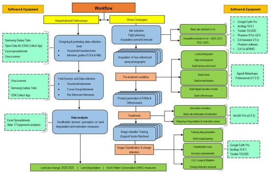 A combination of drone-based land use change analysis, household surveys, and interviews were used to achieve the study objectives. Household surveys were specifically conducted to gauge farmers’ perceptions regarding land use, management, degradation, and adopted SWC measures, specifically in reducing soil erosion in the study area. Figure 3 outlines the overall methodological steps and materials used in this study.
