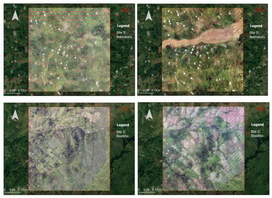The results of the accuracy assessment showed that the 24 maps from six sites and eight land use classes considered by this study were in agreement since the overall accuracy was above 80% []. The heterogeneity between classes in the study area, especially between grassland, bushland, and agriculture, have been previously reported to limit the classification accuracy []. Additionally, the sudden change in weather (strong winds followed by a storm) affected some drone flights and led to incomplete data for the Nakhatore site in 2021 (Figure 6). This limitation on drones has been documented to affect aerial surveys in the tropics [,].