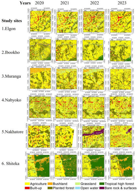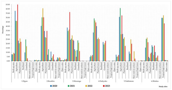 Figure 6 further illustrates the spatial land use patterns from 2020 to 2023 across the six study sites. Note that bad weather affected drone flights in 2021, as seen Figure 6, due to the early onset of the rainfall season, but the Nakhatore site was not completely covered. Agriculture and planted forest is clearly seen as dominant land use types, especially in Elgon, Ibookho, Muranga, Nabyoko, and Nakhatore. However, tropical high forest was the dominant land use in Shiteka, followed by bushland and agriculture. Built-up areas were most visible in Nakhatore, Nabyoko, and most prominently, in Elgon. The grassland coverage is generally low and was easily converted to agriculture, as clearly seen in Muranga (2022 and 2023). Open water was constrained in areas with river streams, especially in Shiteka and Ibookho. Bare rock and surfaces was very minimal except after the occurrence of a landslide in Nakhatore in 2022 (Figure 6). Although agriculture reclaimed most of the coverage in 2023 in the Nakhatore site, planted forest was lost as a consequence and a river stream emerged after the landslide. This led to the appearance of open water in 2022 and 2023 in Nakhatore.