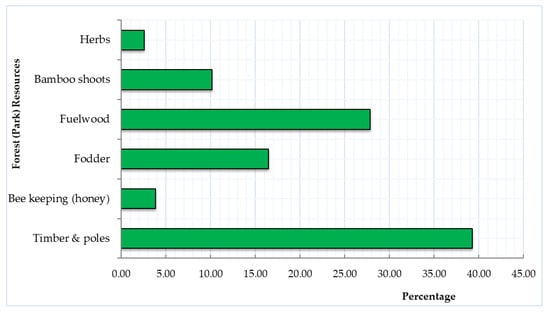 The results in Figure 7 show the variety of products extracted from MENP by the respondents in this study. Timber and poles (39%), fuelwood (28%), fodder (17%), and bamboo shoots (11%) were the primary resources harvested by the respondents, while the smallest numbers were harvested honey (3%) and wild herbs and vegetables (2%) from the park.