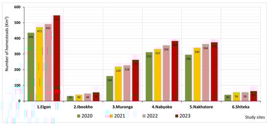 Land utilization within the communal land primarily involves homesteads development, subsistence farming, and tree plantations. The number of homesteads per square kilometer trended upwards from 2020 to 2023 consistently across the six sites (Figure 8), with the lowest (32) in 2020 and peaking at 548 in 2023 in the Ibookho and Elgon sites, respectively. The results revealed a general increase in homesteads per year in every study site. Further, the Elgon site consistently recorded the highest number of homesteads per square kilometer (>400) from 2020 to 2023, followed by Nabyoko and Nakhatore with an annual average of 345 homesteads per square kilometer. Annually, the Muranga site averaged 218 homesteads per square kilometer, while Shiteka and Ibookho had the lowest (<50) average of homesteads per square kilometer. Notably, Muranga, Ibookho, and Shiteka are adjacent to the conservation area where the establishment of homesteads is legally prohibited. Nonetheless, the study revealed isolated homesteads in these restricted zones.