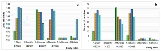 Drone orthomosaic results revealed the widespread use of trenches as a significant SWC measure across the study sites. Figure 9 illustrates the farmland area with trenches and the number of trenches established within the farmland of study sites. Elgon, Muranga, and Nabyoko had the largest farmland area (>0.5 ha) with trenches and the highest number of trenches (>15) in the farmland. These sites coincide with areas where a high number of homesteads was observed (see Figure 8). The number of trenches peaked in 2021 and 2022 as compared to the start and end years of the study. This is partly attributed to limited knowledge prior to 2020 and inadequate routine maintenance (desilting) of the trenches by farm owners. Shiteka and Nakhatore had the smallest number of trenches (<5) per site, while Ibookho had none. The study revealed that trenches were mainly established in banana–coffee plantations, especially near homesteads and not on fields far away or near the park. Some trenches may not have been visible due to high canopy cover in the coffee and banana plantations.