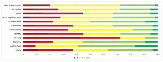 This assessment was confirmed in the following answer, in which the respondent was asked to assess, from “much worse” to “much better”, ten dimensions: safety, architecture, economy, housing, identity, sustainability, cleanliness, entertainment, neighbourhood and air quality (Figure 3). Here, housing stood out as the only domain that gathered the large majority of negative responses (39, with 23 of “much worse”). In all the others, except in relation to noise and safety, an improvement was noted, specifically in architecture (32 positive, 5 negative and 17 intermediate assessments), the economy (30 positive v 12 negative +12) and entertainment (27 positive v 12 negative +15).