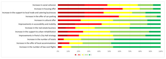 In fact, tourism has a multifaceted nature, and it is hard to individualise and manage the complex interactions and conflicting interests. Furthermore, in the specific case of Baixa, after a long crisis in the city centre, it is easier to understand that a valuation of the positive aspects of tourism prevails, which brings us to the idea that its acceptance or challenge will not depend only on scale and its proportions, but also on the social, economic, political, and institutional context [59]. In fact, in Porto, tourism has had a pivotal effect on the disruption of a long cycle of devaluation of the city centre, which is particularly evident in the continuous decline in population, urban de-qualification and the strong expression of derelict buildings. The memory of the economic crisis of the years 2007 and 2008, which was long and intense and impacted the independent shops in the city centre in a very particular manner, must be also important in the assessment. On the other hand, and similar to what occurred in many other cities, the increase in prices and the replacement of housing units by hotels or short-term accommodation, and their effect on the expulsion of residents and the increase in the difficulty of settlement, has led many to negatively assess changes and to identify this domain as a political priority in the city of Porto.