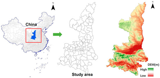 Shaanxi Province, located in the northwest of China, is divided administratively into 10 prefecture-level cities, 30 districts, 5 county-level cities, and 72 counties (refer to the Figure 1). As of the end of 2022, the permanent resident population of Shaanxi Province reached 39.56 million, increasing by 20,000 compared to the previous year. The level and quality of urbanization in Shaanxi Province have steadily improved, with the urbanization rate of the permanent resident population reaching 64.02%. Geographically, Shaanxi Province can be divided into three regions: the northern Shaanxi Loess Plateau, the central Guanzhong Plain, and the southern Shaanxi Qinba Mountainous Area. The northern Shaanxi Loess Plateau is characterized by grasslands and arable land, supporting a well-developed economy based on abundant mineral resources. The Guanzhong Plain is a flat platform dominated by arable land and construction land, serving as a significant economic hub in Shaanxi Province. The southern Shaanxi region mainly consists of hilly and mountainous areas, with the majority of land being forests. Due to its geographical location and terrain, this region exhibits a relatively low level of economic development.