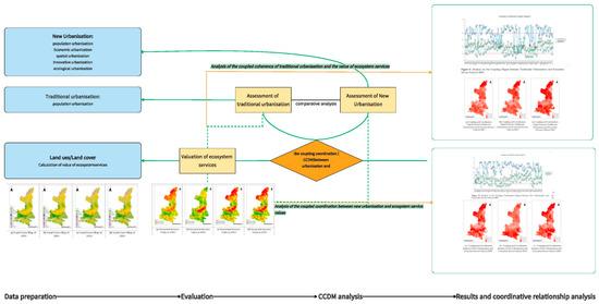 Figure 2. A framework diagram of ideas for analyzing the coupled co-ordination of the quality of new urbanization and the value of ecosystem services.