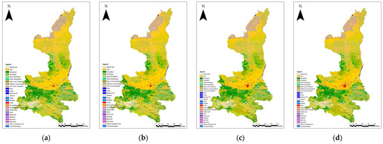 Figure 3. Land cover maps from 1990 to 2020. (a) Land Cover Map of 1990. (b) Land Cover Map of 2000. (c) Land Cover Map of 2010. (d) Land Cover Map of 2020.