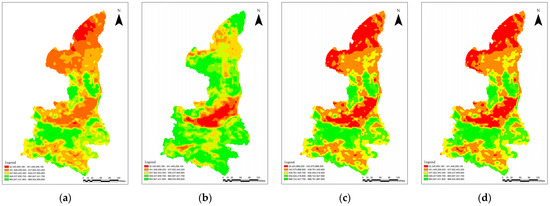 Figure 4. Ecological service value from 1990 to 2020. (a) Ecosystem Services Value in 1990. (b) Ecosystem Services Value in 2000. (c) Ecosystem Services Value in 2010. (d) Ecosystem Services Value in 2020.
