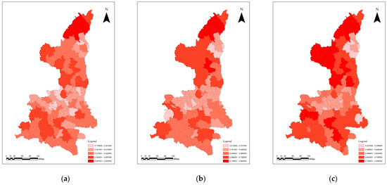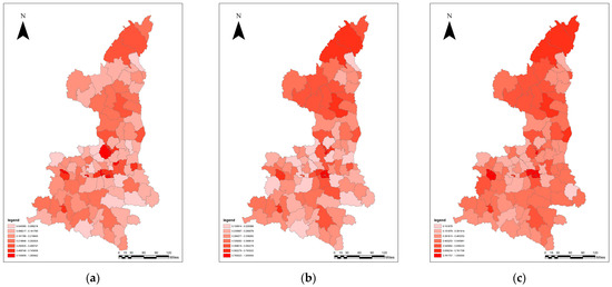 Figure 5. Results of traditional urbanization from 2000 to 2020. (a) Traditional Urbanization in the Year 2000. (b) Traditional Urbanization in the Year 2010. (c) Traditional Urbanization in the Year 2020.