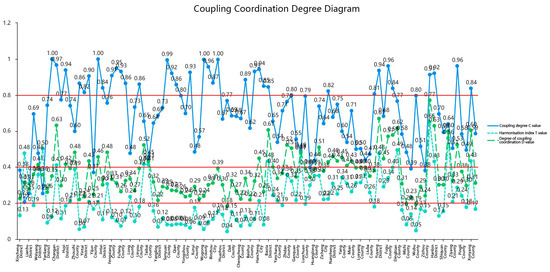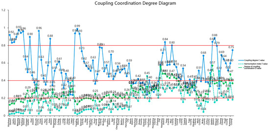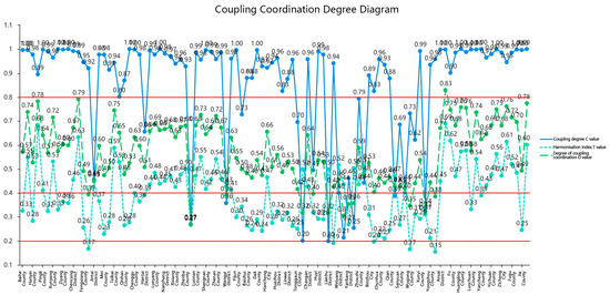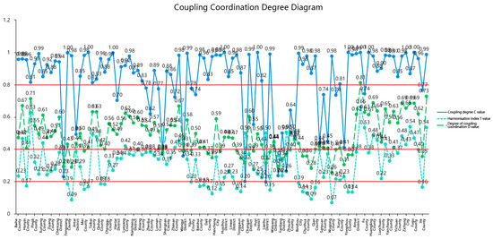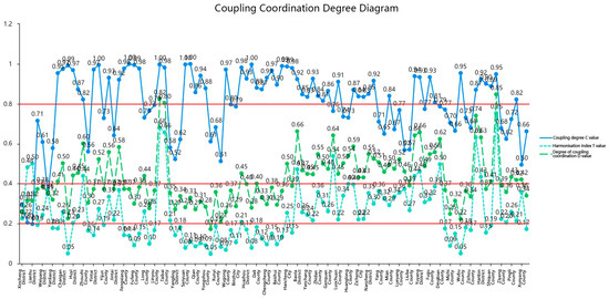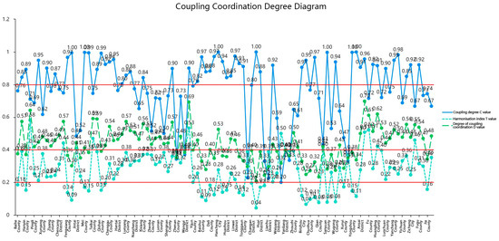 D represents the co-ordination degree, T represents the comprehensive co-ordination index, α and β are undetermined coefficients, and their sum equals 1. In this study, the ecosystem and the new urbanization system are regarded as mutually influential and equally significant; hence, α = β = 0.5 in the formula. Drawing on pertinent studies [67,68], a higher co-ordination degree indicates better co-ordination. Specifically, the co-ordination degree is categorized into nine levels(refer to the Table 4).