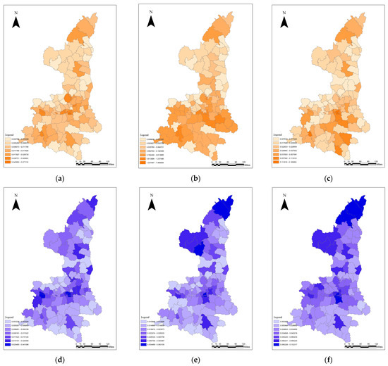 In terms of the spatiotemporal changes in urbanization indicators, the overall level of population urbanization exhibited a polycentric pattern from 2000 to 2020. Additionally, the average level of urbanization in the Guanzhong region surpassed that in both the Shaannan and Shaanbei regions. Specifically, in the Guanzhong region, there was a phenomenon of decreasing urbanization levels from the core area of Yanta District to its surrounding regions. In the Shaannan region, the levels of urbanization across different counties were relatively balanced. In the Shaanbei region, significant spatial disparities in urbanization were observed, with Shenmu County and Yuyang District exhibiting higher values compared to other areas, resulting in substantial spatial differentiation.