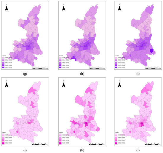 This article presents an evaluation system consisting of five dimensions: population urbanization, economic urbanization, spatial urbanization, innovation urbanization, and ecological urbanization. The figure below illustrates the changes in urbanization levels in different counties of Shaanxi Province from 2000 to 2020(Figure 10). The evaluation results for the dimension of population urbanization increased from 0.0143 to 0.0349, representing a growth of 143.83%. The growth of population urbanization in the Guanzhong region is greater than in the various counties of southern Shaanxi as well as in northern Shaanxi. The highest growth rate is observed in Langu County of Ankang City in southern Shaanxi. The level of economic urbanization increased from 0.001 in 2000 to 0.0455 in 2020, representing a growth of 3.34%. The growth rate is relatively fast, averaging at 4.00%. The overall level of spatial urbanization exhibited an upward trend, with only five counties experiencing a decrease. The level of spatial urbanization in Shaanxi Province increased by 34.91% from 2000 to 2020. The level of innovation urbanization has continuously increased, with the mean value rising from 0.000061 to 0.0092, resulting in an overall increase of 150.41%. Certain districts and counties in the Guanzhong region (e.g., Chang’an District and Beilin District in Xi’an City) exhibited significant increases in innovation urbanization, with growth rates of 4022.41% and 953.85%, respectively. The average annual growth rate of county-level innovation urbanization is 7.52%. The average value of the ecological urbanization dimension showed a slight increase, with an overall growth of 24.70% from 2000 to 2020. The average growth rate is 1.23% per year. A total of 18.69% of the counties experienced a decrease in the level of ecological urbanization, primarily concentrated in the Guanzhong region.
