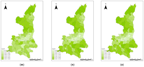 Figure 10. Dimensions of new urbanization results from 2000 to 2020. (a) Urbanization of the Population in the Year 2000. (b) Urbanization of the Population in the Year 2010. (c) Urbanization of the Population in the Year 2020. (d) Urbanization of the Economic in the Year 2000. (e) Urbanization of the Economic in the Year 2010. (f) Urbanization of the Economic in the Year 2020. (g) Urbanization of the Spatial in the Year 2000. (h) Urbanization of the Spatial in the Year 2010. (i) Urbanization of the Spatial in the Year 2020. (j) Urbanization of the Innovative in the Year 2000. (k) Urbanization of the Innovative in the Year 2010. (l) Urbanization of the Innovative in the Year 2020. (m) Urbanization of the Ecological in the Year 2000. (n) Urbanization of the Ecological in the Year 2010. (o) Urbanization of the Ecological in the Year 2020.
