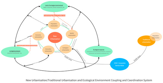 Therefore, China has introduced a new approach to urbanization construction. This new model places emphasis on people-centered development, prioritizes ecological environment protection, and strives for sustainable development throughout the urbanization process [14,15,16,17,18]. The present state of new urbanization construction and the co-ordinated development between new urbanization and ecosystems have emerged as prominent areas of research [19,20,21,22].