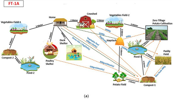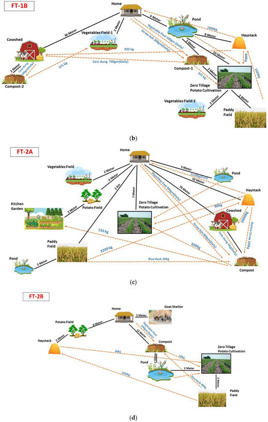 Across different farm types of subtle variations in resource recycling, patterns exist due to contextual factors including landholding and fragmentation, distance from the homestead, pond, and cattle ownership, competing crop demand for manure and irrigation water, and family labour availability. For instance, in FT-1A (Figure 2a), manure application is relatively higher but straw usage is relatively lower than other farm types due to its primary use as cattle feed and fuel (Figure 3b). Biomass for compost preparation is collected from diverse sources such as cattle shed, poultry litter, and household waste. The field’s proximity to the homestead and pond also improves the management of ZTPC.