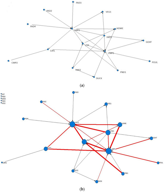 Combined network diagram of all nine farms: (a) nonweighted, (b) nodes scaled by 2-eigenvector centrality, and (c) nodes scaled by betweenness centrality. Line thickness represents the magnitude of resource flow. Black lines have negligible flow of resources between elements. PAD—paddy; HAY—haystack; PND—pond; GOAT—goat; DUCK—duck; POUL—poultry; CMP—compost; CATL—cattle; ZTP—zero-tillage potato; VEG—vegetable; HOME—home.