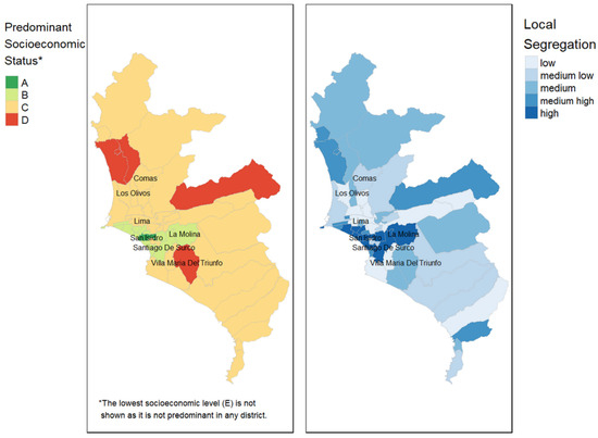 Left: Map of Lima by predominant (modal) socioeconomic (SES) level, where A is the highest and E the lowest. The lowest SES level, E, is not shown on the map as it is not the mode in any of the city’s districts. The SES levels are calculated by the Peruvian National Institute of Statistics and Informatics based on household income. For reference, the percentages of dwellings per SES at the city level are A = 5.1, B = 19.7, C = 40.3, D = 25.9, E = 9.0. Right: Map of Lima by level local segregation. Darker colours indicate higher segregation within the district by comparison with the city.