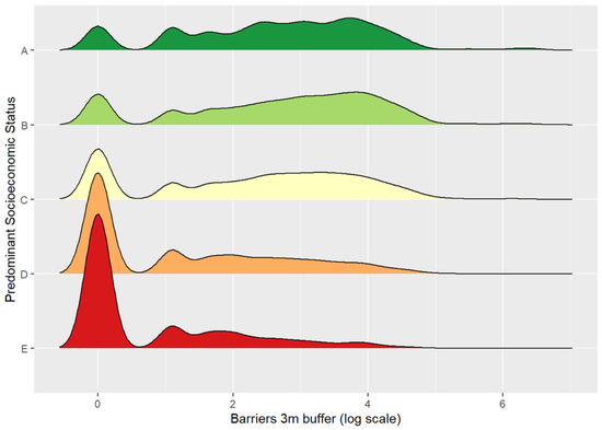 Ridgeline density plots of barriers (3 m buffer) by SES. Each density curve represents the estimated (smoothed) distribution of barriers around blocks grouped by predominant SES. The data are logged using to facilitate visual comparisons.
