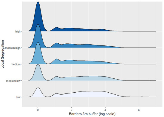 Ridgeline density plots of barriers (3 m buffer) by local segregation score. Given that local segregation is a continuous variable, the levels of segregation are calculated through kmeans clustering. Each density curve represents the estimated (smoothed) distribution of barriers around blocks grouped by level of segregation. The data are logged using to facilitate visual comparisons.