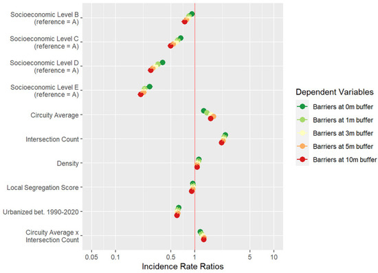 The negative binomial models indicate that, in addition to socioeconomic status, the variation in barriers responds to features of the urban design. In Figure 6, I show the models predicting barriers at different buffers around the 1 km pedestrian network from the block. The model coefficients are displayed as standardized incidence rate ratios.