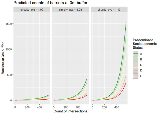 Predicted counts of barriers at a 3 m buffer by different levels of circuity average, counts of intersections, and SES levels.