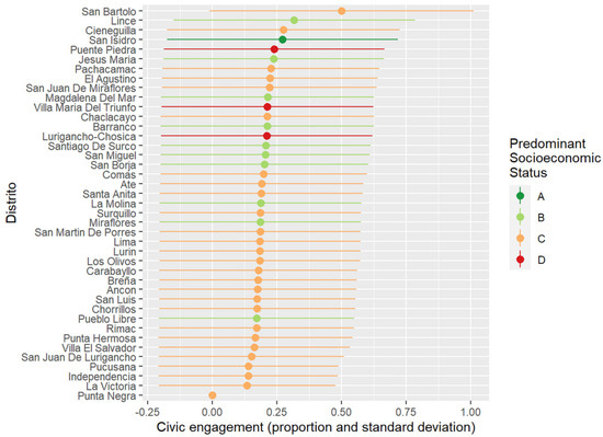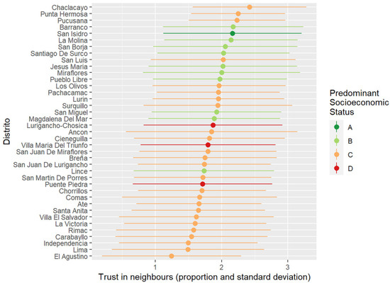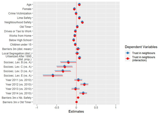Second, I use 10 waves of the Lima Cómo Vamos survey (2010–2019) on urban issues (N = 12,000 per year) to assess the impact of higher environmental exposure to barriers on social capital. The relationship between barriers and social capital is not necessarily causal. The correlation between measures of these concepts may respond to underlying dynamics of social differentiation—e.g., racial or class divisions [18]. I explore the causal effect of barriers on social capital based on theoretical and empirical considerations. Theoretically, I suggest that micro-segregating barriers built on public spaces convey meanings of fear and exclusion that not only amplify existing forms of social fragmentation but bound the sense of belonging to narrow (and spatially close) communities. Empirically, most existing barriers in Lima were built between the late 1990s and early 2000s, while the survey data were collected in the 2010s [19]. Respondents had been living in a fragmented city for about a decade at the time of first survey. My multilevel models provide preliminary evidence of this causal relationship, considering the coarse spatial aggregation of the data. Individuals are nested within their districts of residence (43 districts in total), the smallest geographic unit available. My results provide evidence that otherwise comparable individuals living in areas with more barriers are less likely to participate in civic actions (e.g., volunteering in neighbourhood organizations) but more likely to trust their neighbours.