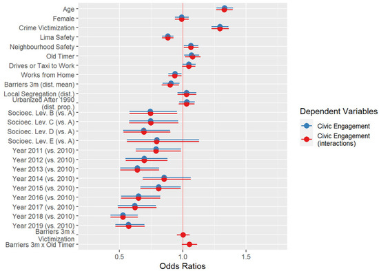 The individual-level variables in include several factors usually associated with civic engagement, including socioeconomic status1, age, gender, living for over ten years in the city (old timer), whether the respondent works outside the home, and their main form of transportation (driving or taxi versus others). I incorporated measures of perception of safety and prior crime victimization, as research shows that the latter increases political engagement [76]. As controls, I considered the year of the survey, district-level local segregation scores, and the proportion of blocks urbanized after 1990. I report one additional model including two cross-level interaction terms to account for the potential enhancing effects of victimization and being an old timer on barriers.