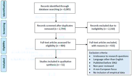 The SLR search protocol delineated relevant inclusion and exclusion criteria, defined key concepts, and identified appropriate search terms for input into the selected literature databases. The search was confined to papers published between 1962 and 2019, covering a period from the launch of CAP to the most recent lifecycle stage of the CAP prior to the expected adoption of reforms in 2020 (agreement on reform was eventually adopted in 2021), as well as policy and subsidy uncertainty in the UK related to BREXIT. Inclusion criteria included the use of empirical data collected from EU countries (which then also included the UK) and Switzerland, relevance to the research questions, English language, and peer review. A set of search terms were derived from the initial research questions using associated key words and phrases. A wide variety of search terms were used to cover the multiple contexts in which decisions about PGs could be made. Search strings were trialed and refined in a multistep process, with the face validity of each search assessed against the appropriateness of its focus in relation to the research questions. Searches were conducted in Google Scholar and replicated in Science Direct and Scopus []. Where there were more than 100 results in both Google Scholar or Scopus searches, the first 100 records were downloaded and included in the review (equivalent to 10 pages of Google Scholar results), thus capturing the most relevant hits while still representing the extant literature and a feasible number of papers to screen []. The results of all searches were exported to a Mendeley library, combined, and duplicate or incomplete records were removed, returning a total of 2794 papers.