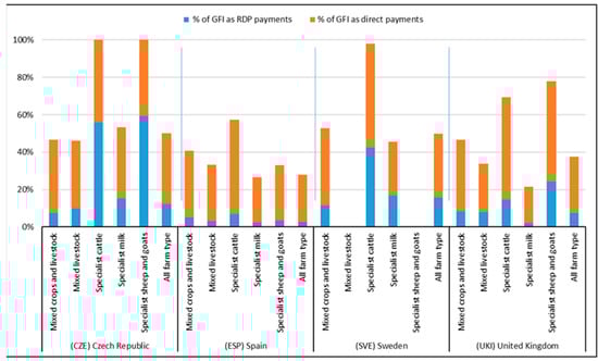 Research articles reported that CAP subsidy payments represent an important element of farm incomes. For example, in the UK it was estimated that payments represented 55% of farm incomes in 2014 []. An Italian article on High Nature Value (HNV) farms, which include PGs and low-intensity livestock systems, similarly found that subsidies comprised more than 40% of the Net Value Added, but there was a high reliance on Pillar 2 AES and Pillar 1 LFA scheme payments []. The analysis of FADN data from 2008 to 2017 revealed a varied picture of reliance on CAP payments across the Czech Republic, Spain, Sweden, and UK, which was also influenced by farm type.