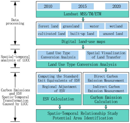 The research methodology adopted in this study is illustrated in Figure 2. Using land use vector data from 2010, 2015, and 2020, the study employs the ArcGIS spatial analysis tool to calculate the land transfer matrix based on LUCC, facilitating spatial visualization of land transfer scenarios. Furthermore, the study allocates land use types at the county level. The Ecosystem Service Value (ESV) is calculated using a per-area value equivalent factor method, which involves multiplying the land area by corresponding adjustment coefficients. Carbon emissions are determined by adding direct carbon emissions, calculated by multiplying land area by specific coefficients, to the indirect emissions generated from construction land. Lastly, the study conducts a correlation analysis to identify regions in the Guanzhong urban agglomeration with the potential for enhancing ecosystem services and carbon reduction.