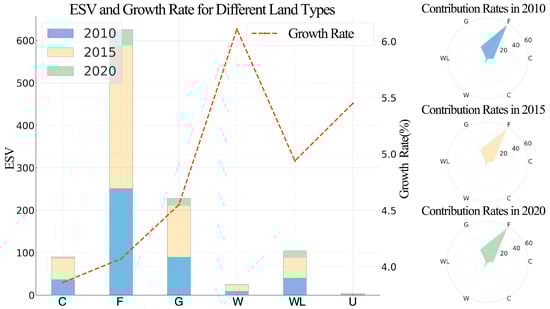 Comparison of ESV Growth and Contribution Rates for Various Land Uses in the Guanzhong urban agglomeration. Image source: Drawn by the author.